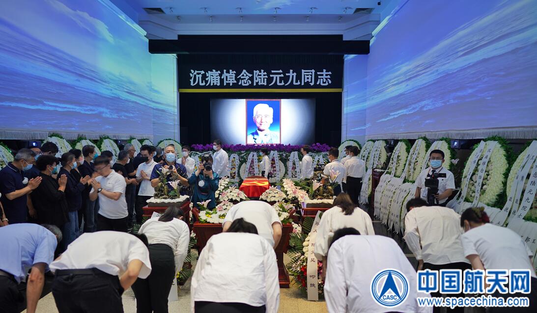 早上9點(diǎn),上千人聚集在八寶山殯儀館東禮堂門前,陸元九同志的同事、親友、學(xué)生、晚輩前來(lái)送他最后一程。禮堂門前掛起挽聯(lián):“殫精強(qiáng)國(guó) 一縷英魂存海宇”“竭慮宇航 滿腔熱血貫云天”。陸元九同志的遺體安臥在鮮花之中,身上覆蓋著鮮紅的中國(guó)共產(chǎn)黨黨旗。