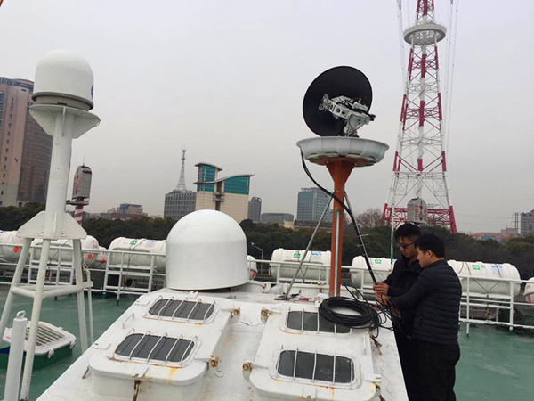 船載衛(wèi)星站“普陀山”輪的開通工作現(xiàn)場(chǎng)