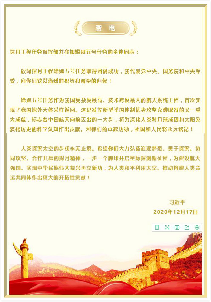 12月17日1時59分,嫦娥五號返回器攜帶月球樣品在內(nèi)蒙古四子王旗預(yù)定區(qū)域安全著陸,探月工程嫦娥五號任務(wù)取得圓滿成功。中共中央總書記、國家主席、中央軍委主席習(xí)近平發(fā)來賀電,代表黨中央、國務(wù)院和中央軍委,向探月工程任務(wù)指揮部并參加嫦娥五號任務(wù)的全體同志致以熱烈的祝賀和誠摯的問候。